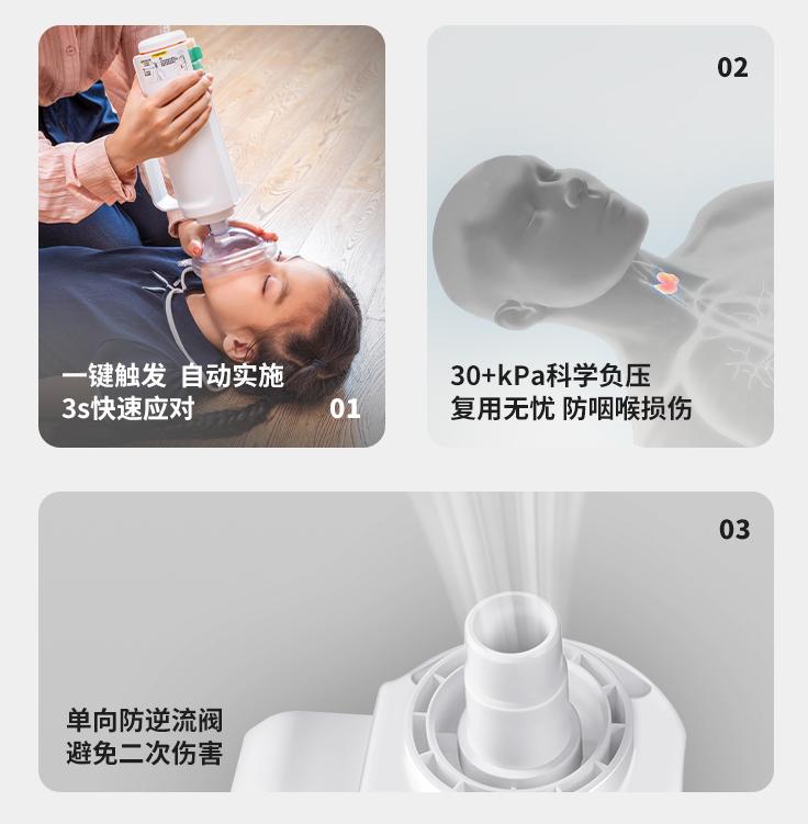 這款防窒息急救器利用負壓抽吸的原理,在上氣道形成瞬時負向氣流,快速將阻塞氣道的異物吸出。使用時,只需一鍵觸發(fā),3秒快速實施,搭配多款氣囊面罩及壓舌管,適配不同人群,采用單向防逆流閥設(shè)計,只抽氣,不送氣,避免造成二次傷害,30+kpa穩(wěn)定負壓,防咽喉損傷,操作簡單,無人群使用區(qū)別,無需專業(yè)訓(xùn)練,輕松實現(xiàn)自救或他救。